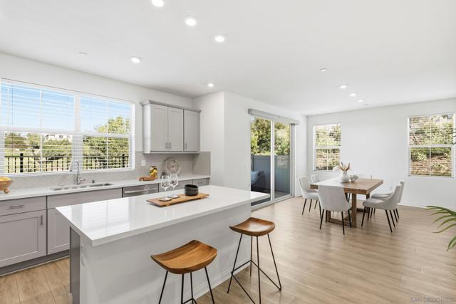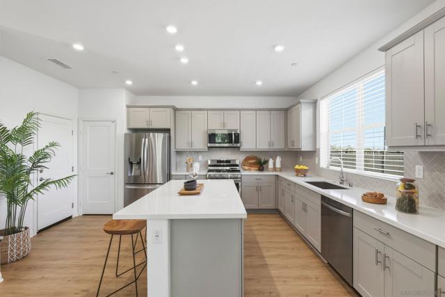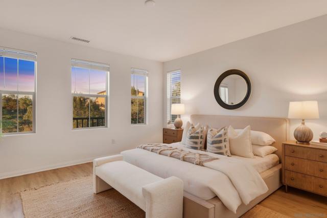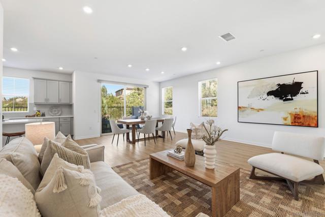 Move-in ready townhome with breathtaking canyon and mountain views, located in the beautiful Oceanside community of Melrose Heights. Built in 2022, this prime-location, two-story luxury townhome features OWNED Solar and a thoughtfully designed open-concept layout where the kitchen, living, and dining areas all capture stunning views. LVP flooring throughout. A convenient first-floor powder room adds functionality for guests. The chef’s kitchen is a standout, showcasing an oversized island, quartz countertops, LED recessed lighting, expansive counter and cabinet space, a large pantry, and top-of-the-line Samsung and LG stainless steel appliances. Situated on a premier lot with no neighbors in front, behind, or on one side, the home offers exceptional privacy along with a spacious, fenced in backyard with custom designed concrete patio. Second floor showcases a luxurious primary suite featuring white quartz countertops, walk in shower, soaking tub, and an oversized walk in closet. Three additional bedrooms, a full bathroom with dual-sink vanity, and a second-floor laundry room with built-in cabinetry. Smart energy efficient home with paid off solar is equipped with robust EERO wifi boosters and smart thermostats. Additional upgrades include Premium Norman sunshades and custom tile in all bathrooms and kitchen. Attached two-car garage with dual single-car doors. Melrose Heights offers resort-style amenities including a pool and spa, playgrounds, and excellent walkability. Conveniently located near shopping, dining, and Vista Sports Park—this exceptional home is a must-see