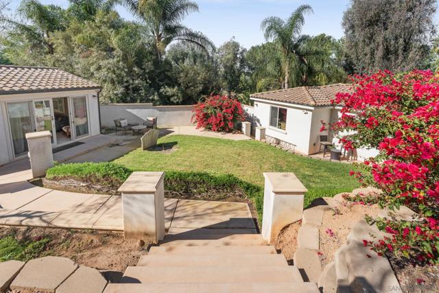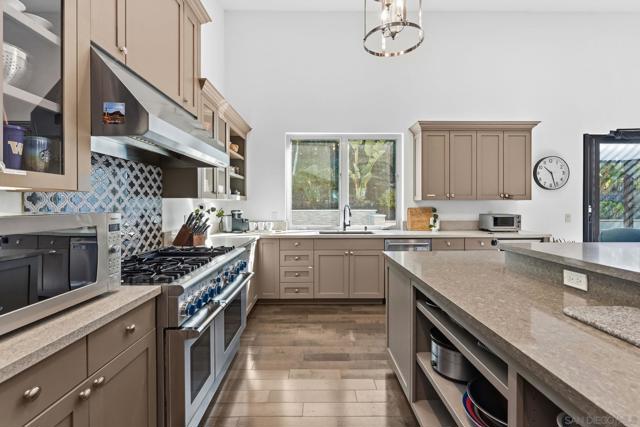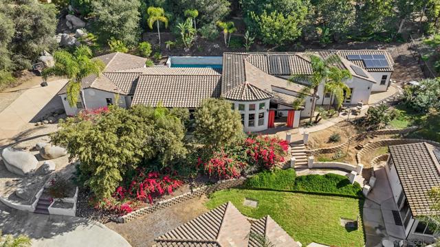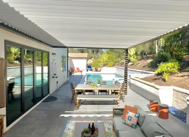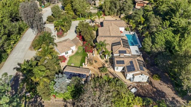 Discover exceptional resort-style living on serene, one-acre corner lot in the prestigious Trails of RB. This custom-built, single-story home—boasting a classic, timeless design—delivers the ultimate in multi-generational versatility and tranquility, featuring a private detached casita (ADU) and a breathtaking backyard oasis perfect for year-round enjoyment. Soaring ceilings, vaulting to 14 feet in the expansive great room, fill the home with abundant natural light and sense of openness that flows seamlessly from living spaces to the heart of the home: the chef’s dream kitchen. Overlooking the pool, this culinary centerpiece is crafted for both daily living and grand entertaining, with oversized island w/ seating, adjacent dining nook, wine refrigerator, and premium Thermador appliances incl a built-in refrigerator, 6-burner range w/ griddle, and double ovens. Formal dining room—currently styled as a sophisticated family game room with ping pong and billiards—offers incredible flexibility for hosting, hobbies, or creative pursuits. Seamless indoor-outdoor living reaches new heights with expansive retractable glass walls that completely open, merging the great room with the outdoor entertaining area into one magnificent, breezy space—ideal for California’s enviable climate. The luxurious primary suite, privately positioned at one end of the home, serves as a true sanctuary with direct access to the backyard and pool for peaceful mornings or serene evenings. The spa-inspired en-suite bath features a deep soaking tub, separate walk-in showers, a built-in vanity area, and an oversized walk-in closet designed for the most discerning wardrobe. Every secondary bedroom is a generous suite with its own private full bath (tub and shower). A separate family room along the secondary wing includes a built-in desk and cabinetry, and the spacious laundry room offers abundant storage. In addition, the residence boasts a dedicated flex space/den, an ideal setting for a home office, workspace, or private gym. Families that enjoy multi-generational living or frequent guests will appreciate the cozy detached casita (ADU), complete with its own bedroom, full bath, and kitchen area—offering privacy and flexibility, and it could also serve as a private workspace. The backyard is a true private oasis: a smart-controlled sparkling pool and spa (solar-heated for energy efficiency), a touch-button convertible patio cover for all-weather use, lush mature landscaping with fruit trees and palms, and room to relax or play. Enhancing sustainability and savings, the home features fully owned (purchased, not leased) solar panels. Practical luxury continues with abundant garage space: a massive attached 3-car garage, complete with an EV-charging station, plus a huge detached stand-alone 2-bay garage perfect for tall vehicles, boats, jet skis, or extra storage. Nestled in the highly regarded Poway Unified School District and just minutes from the I-15 for effortless commuting, this rare offering combines privacy, sophistication, and resort-like amenities in one of North County San Diego’s most coveted neighborhoods. Embrace the lifestyle you’ve been envisioning and experience the timeless elegance and California living that awaits. Be sure to check out the RB Swim & Tennis Club with community pool, playground, tennis, pickleball and MORE...accessible to all residents and included in annual HOA fee.