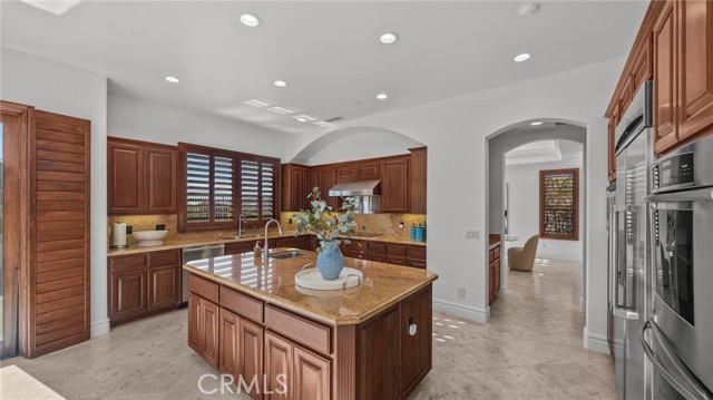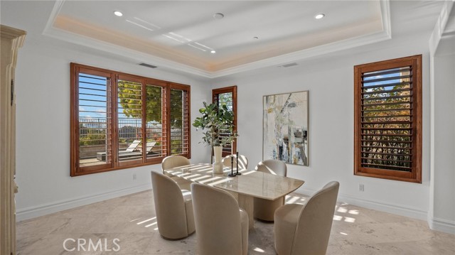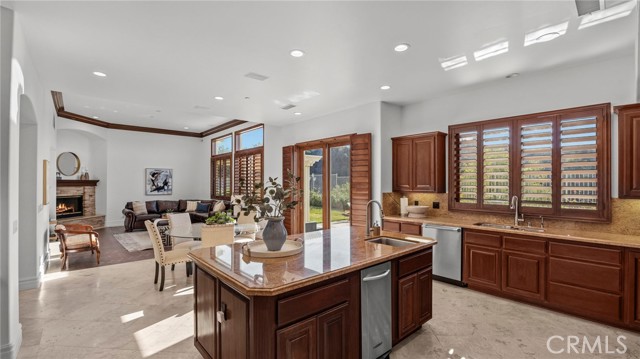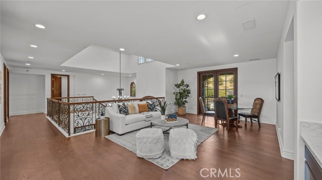 The gourmet chef’s kitchen flows seamlessly into the dramatic, high-ceilinged family and dining room, where walls of windows frame panoramic views of the sparkling pool and rolling hills. Upstairs, an expansive media room is purpose-built for entertainment, complete with a custom cherry-and-quartz bar, kitchenette, and French doors that open to a covered balcony with hillside vistas.
