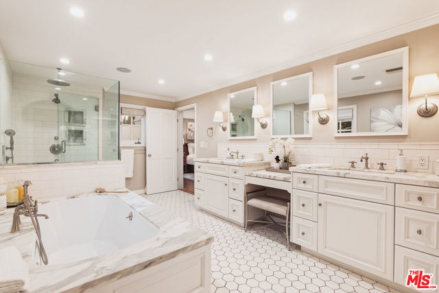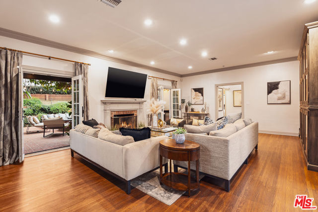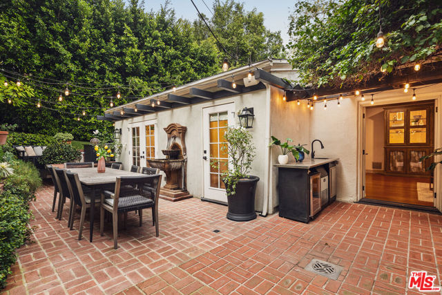 This gated Outpost Estates jewel blends Old Hollywood grandeur with modern luxury beneath a majestic 100-year-old sycamore tree, now enhanced with whole-house audio and unrivaled access to LA's most iconic destinations. Located in the heart of prestigious Outpost Estates, this gated Hollywood charmer is set beneath a magnificent century-old sycamore, seamlessly pairing timeless character with elevated modern living. Originally designed by acclaimed architect Marshall P. Wilkinson, the residence embodies the romance and scale of Old Hollywood, showcasing expansive living spaces, soaring ceilings, intricate crown molding, and rich oak floors throughout. A sprawling, private front yard welcomes you beyond secure gates, setting the stage for a home designed for both grand entertaining and intimate everyday living. Multiple patios and sun-drenched courtyards create a seamless indoor-outdoor flow, offering a variety of inviting spaces to relax and gather. The four-bedroom, four-and-a-half-bathroom residence features a fully reimagined chef's kitchen outfitted with high-end appliances, custom cabinetry, generous storage, countertop seating, and a charming breakfast nook. The kitchen opens effortlessly into the formal dining room and provides direct access to the outdoor entertaining areas, making it ideal for hosting. An expansive living room with fireplace and French doors opens to a private entertaining terrace overlooking lush, mature landscaping. A dedicated office connects to a tranquil courtyard, offering a serene and inspiring work-from-home retreat. The primary suite is a true sanctuary, complete with two walk-in closets and a beautifully updated spa-inspired bath featuring dual vanities, a soaking tub, a framed glass shower, and refined designer finishes. On the lower level, a secondary family room with French doors opens to the front yard, adding versatility and additional living space. Tucked into the hillside, a separate studio with backyard access provides the perfect setting for a creative studio, private office, or wellness space. Outdoors, multiple entertaining areas include a spacious patio, outdoor kitchen, and serene hillside views framed by mature landscaping. The home is further elevated by a whole-house audio system, allowing seamless sound throughout for effortless entertaining and everyday enjoyment. Modern conveniences such as an automated lighting system, extensive Ethernet wiring, a multi-point wireless network, and a smart-controlled sprinkler system enhance comfort and efficiency. Fully fenced and gated with remote entry, the property offers exceptional privacy, security, and peace of mind. Ideally located with easy access to Runyon Canyon Park, the iconic Hollywood Bowl, and some of the city's most celebrated restaurants, this residence delivers the perfect blend of tranquility, prestige, and vibrant city living.