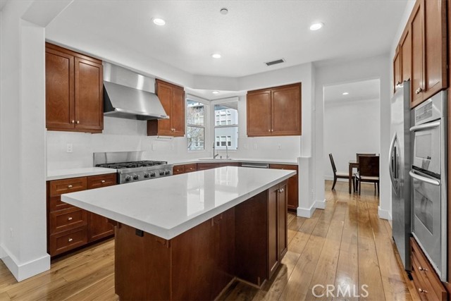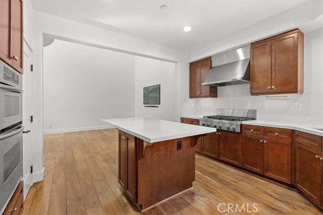 Inside, volume and scale define the experience. A dramatic living room with soaring ceilings and fireplace sets the tone from the moment you enter through the gated front patio. The formal dining room opens to a generous balcony for seamless indoor-outdoor entertaining, while the expansive family room flows effortlessly into a chef’s kitchen appointed with quartz countertops, top-of-the-line stainless steel appliances, a walk-in pantry, and an oversized center island designed for gathering.