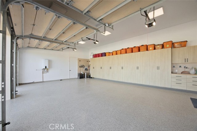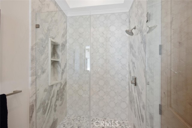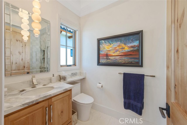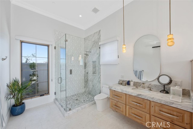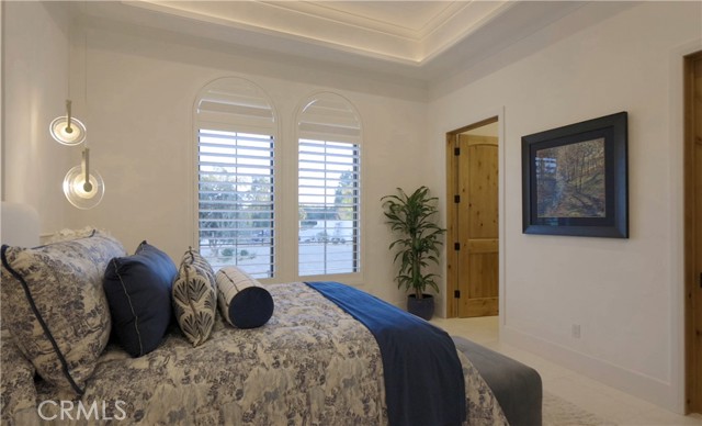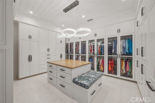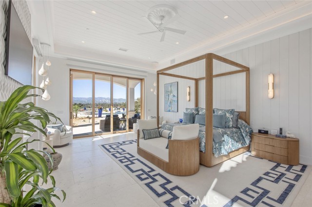 Outside, the gated motor court with permeable pavers leads to an oversized three-car garage. The resort-style grounds showcase a covered patio with wood-paneled ceiling, stone fireplace, and outdoor kitchen. The beach-entry pool features a 10-foot spa, waterfall, fire bowls, and tranquil fountain, complimented by designer pavers.