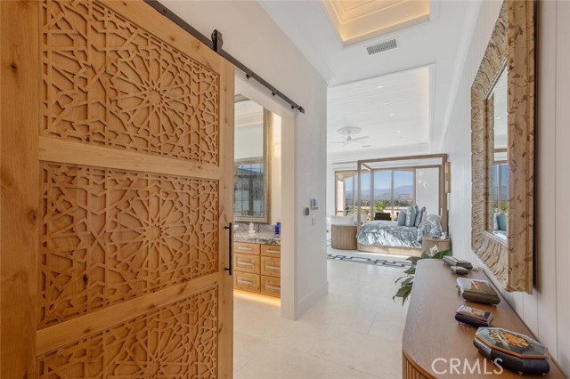 Three secondary bedroom suites feature bespoke finishes and private baths, with one currently styled as a gym overlooking pool and mountain views. The primary suite is a retreat of its own, complete with fireplace, nano doors to the yard, dual custom walk-in closets, and a spa-inspired bath offering a sculptural soaking tub, quartzite vanities, and an oversized backlit quartzite steam shower.
