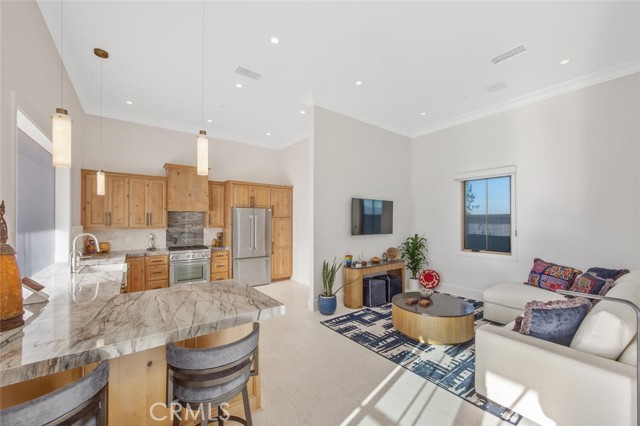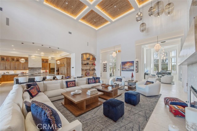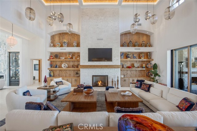 A dramatic foyer introduces Turkish white limestone floors, hand-applied Venetian plaster walls, and a sculptural multi-tier chandelier. Beyond, the great room soars to 26-foot ceilings with a limestone fireplace and expansive 20-foot disappearing nano doors that dissolve the boundary between interior and exterior living.