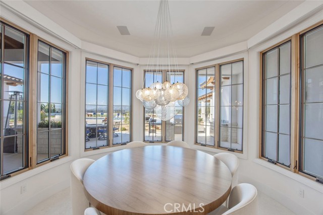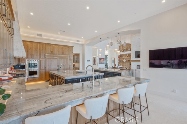 The turret-style living room is framed by 12-foot windows and anchored by a striking quartzite fireplace, while the formal dining room features custom built-ins and designer lighting. The chef’s kitchen impresses with 15’6” ceilings, custom knotty alder cabinetry, dual navy-stained islands, quartzite countertops, premium appliances, and an adjoining circular breakfast nook. A fully equipped prep kitchen, Butler’s Pantry, and concealed walk-in pantry ensure effortless entertaining.