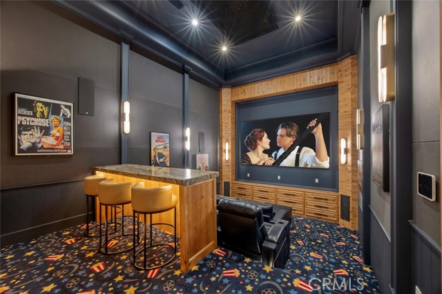 The wine room is a statement piece, clad in backlit gemstone slabs with custom alder racking and a 70-bottle refrigerator. A 50-foot gallery hallway leads to a show-stopping powder room and into thoughtfully designed private spaces, including a tiered theater with 140-inch screen and full bar, and a sophisticated study with quartzite fireplace and French doors opening to a secluded patio.