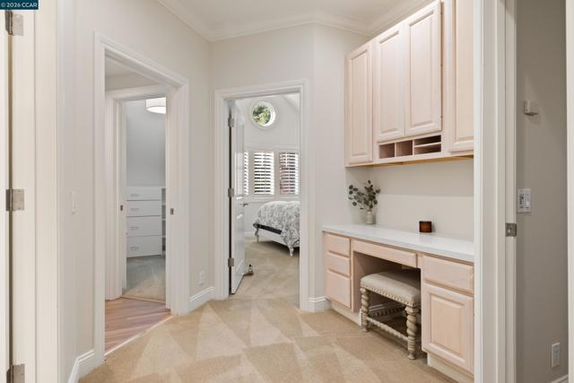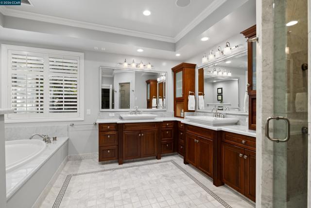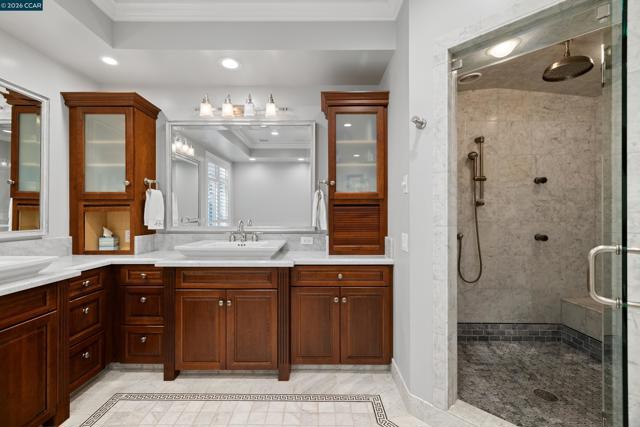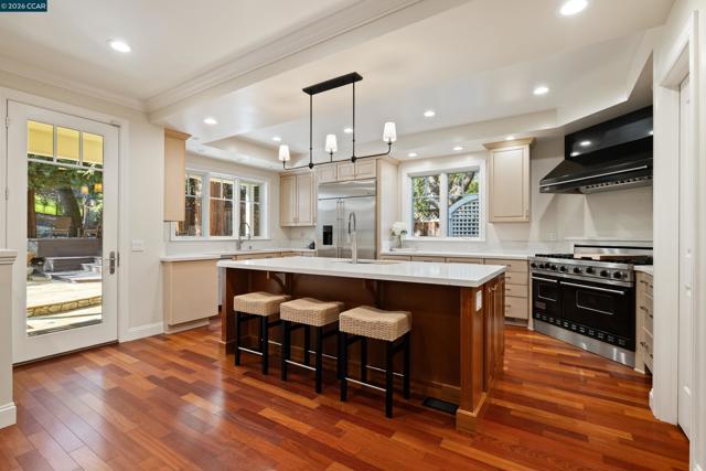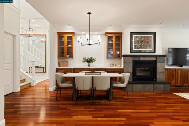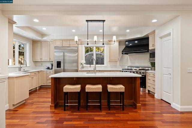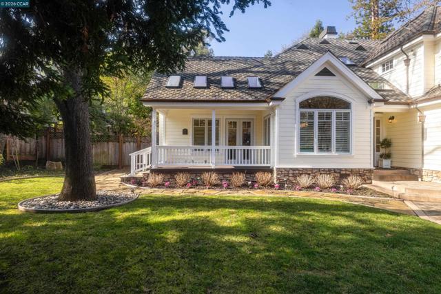 East Coast elegance meets South Walnut Creek living. This remodeled traditional home offers curated living space & a park-like yard. A formal entry w/ soaring ceilings & chandelier lighting. The great room features a chef’s quartz kitchen, w/ restaurant-grade appliances, center island, & designer lighting. The space flows into the breakfast nook & family room, w/custom cabinetry, gas-burning fireplace, + views of the the backyard. The formal dining room is highlighted by a domed ceiling, expansive windows, built-in China cabinet, and French doors to the front deck. The formal living room offers soaring vaulted ceilings, French doors, & a dramatic gas-burning fireplace. The main-level primary suite is complete w/ coffered ceilings, private French doors, a sitting area with fireplace, a walk-in closet, & spa-inspired bathroom with a soaking tub, stall shower, & dual vanities. Upstairs, the four spacious bedrooms feature an additional primary suite. Highlights include a massive bonus room, hardwood floors, built-ins, expansive wine cellar, two-car garage w/ dedicated work area, & abundant storage throughout. Park-like grounds, mature trees, outdoor kitchen, multiple decks and patios. Located minutes from downtown WC, trails, freeways, BART, and 12 years of Walnut Creek schools.