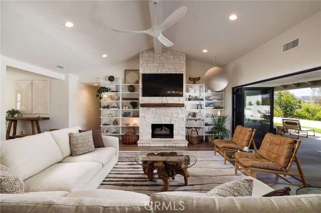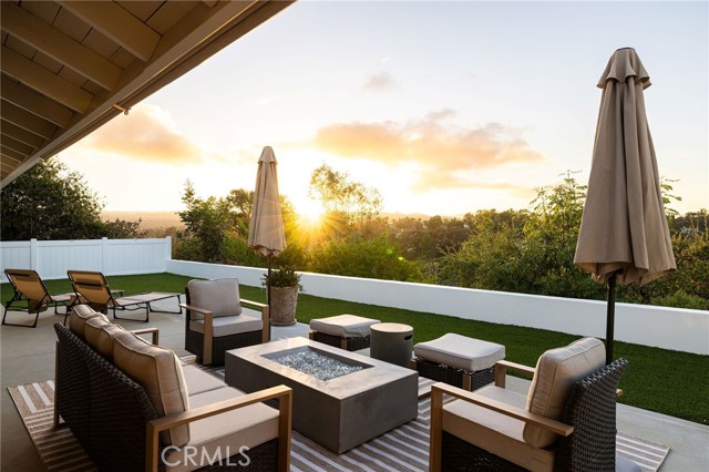 Completely reimagined from top to bottom, this single-level home on a quiet Laguna Niguel cul-de-sac blends modern sophistication with panoramic hillside and sunset views is true indoor-outdoor living. Flowing from thoughtfully renovated living areas through 16-foot bi-fold doors to a fully redesigned backyard, the open-concept floor plan creates a seamless connection between refined interiors and the natural surroundings. At the heart of the home, the large open kitchen features an oversized island with Quartzite countertops with striking Zellige tile backsplash. Stainless steel appliances and custom pull-out shelving balance elegant style with everyday function. The living room is anchored by a new floor-to-ceiling custom stone gas fireplace, built-in bookshelves and an in-wall sound system. A separate relaxing & cozy sitting area with a second gas fireplace and sliding door leads to the garden. The dining area continues the elevated feel with a new custom buffet, walnut countertop, beverage refrigerator and handblown glass chandelier. The primary suite is a private retreat with a spa-like bathroom clad in Calacatta marble tile, a freestanding tub beneath a picture window, a walk-in closet with built-in system and custom bedside chandeliers. Three additional bedrooms and two full bathrooms offer flexible living options. Custom blinds, upgraded door hardware, new built in laundry area and half bath complete the interior of the home. The oversized 2 car garage has new cement flooring with epoxy finish, storage cabinets, attic storage with pull-down access, water filtration and pressure systems. Outside, the entire property has been regraded with new drainage, new landscaping, outdoor lighting, floating stairs, walkways, patios and stucco walls. A built-in gas outdoor cooking station, artificial turf, and fruit trees make the backyard a natural extension of the home. A wider concrete driveway with cobblestone accents, new vinyl fencing, and a new