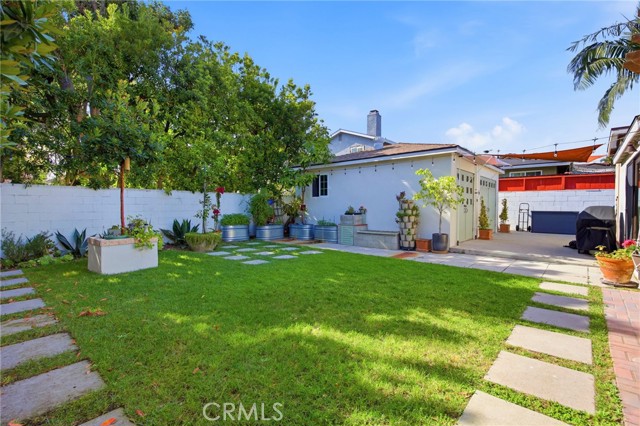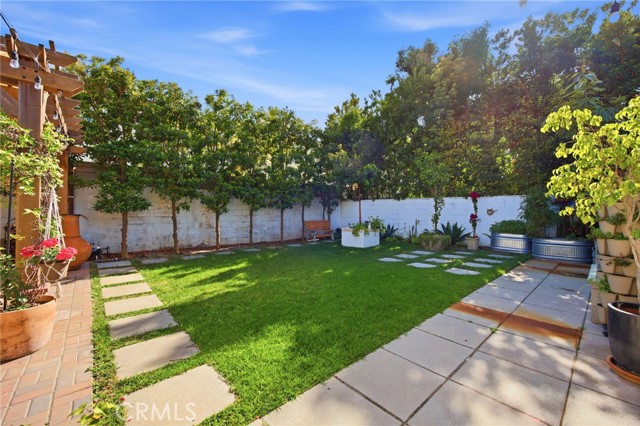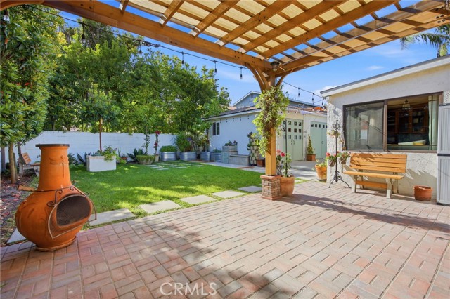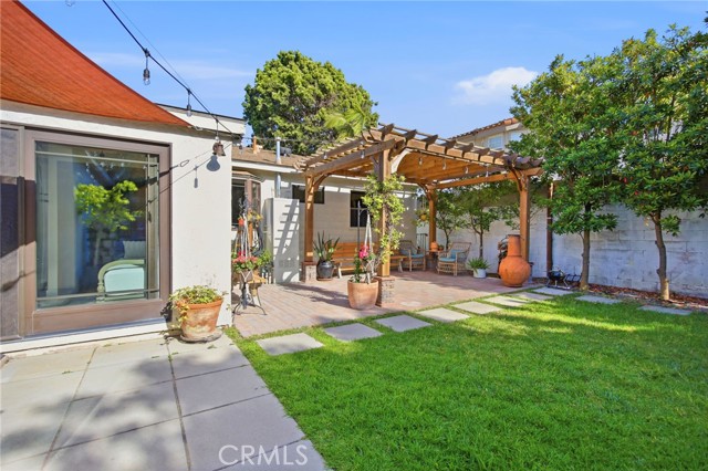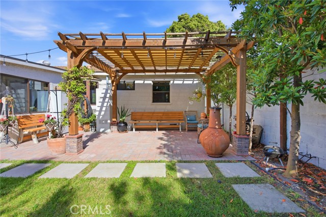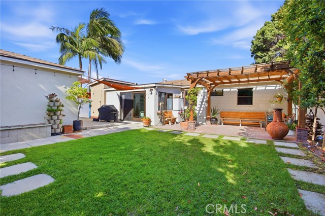 The spacious, beautifully landscaped backyard is designed for enjoyment, featuring a pergola that creates the perfect setting for outdoor dining, entertaining, or simply relaxing.