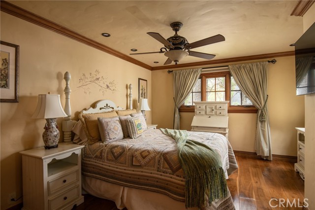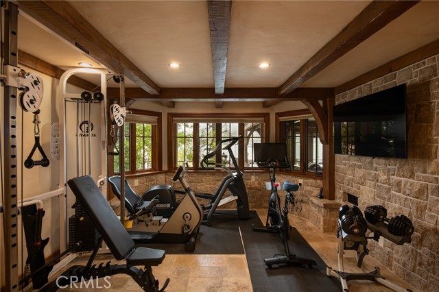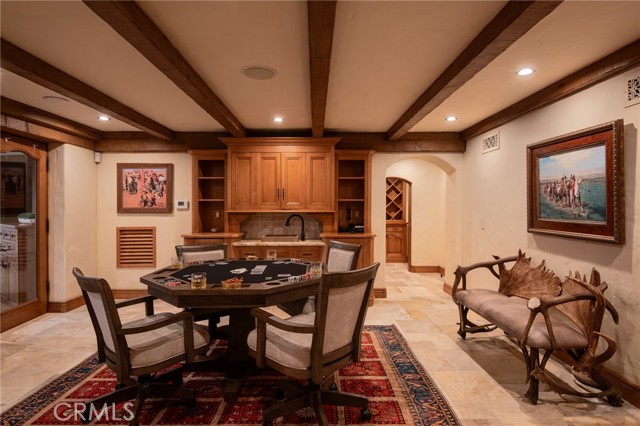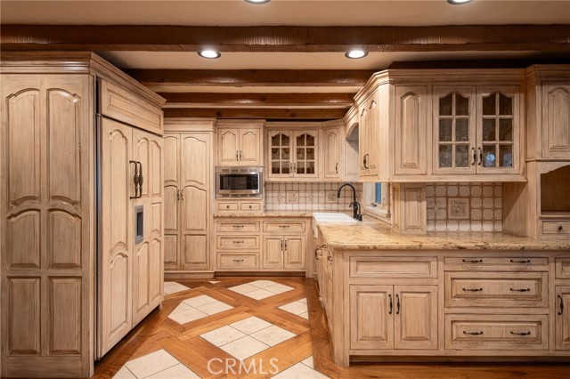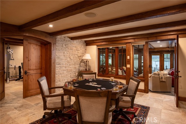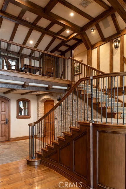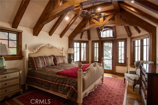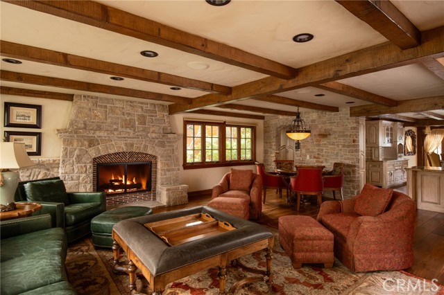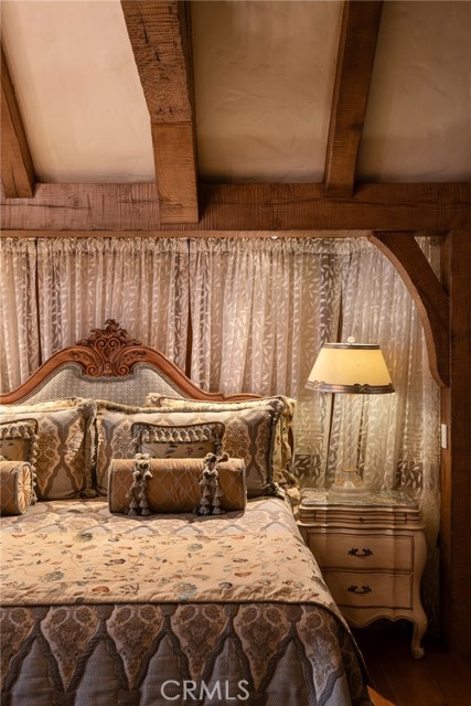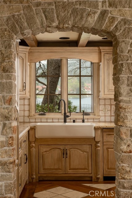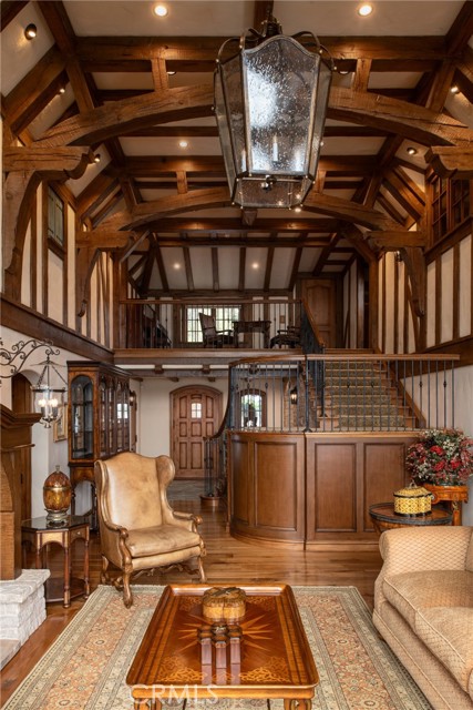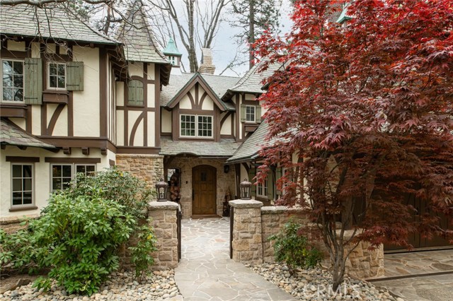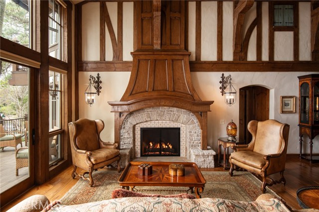 Positioned behind the gated entry of the prestigious Point Hamiltair community, with a dramatic stone approach and directly across from the Lake Arrowhead Village, the home unfolds with a true sense of arrival—reminiscent of a Cotswolds manor. Inside, exposed timber beams, hand-chiseled woodwork, custom wrought iron, and layered artisan finishes create a warm, richly detailed interior.