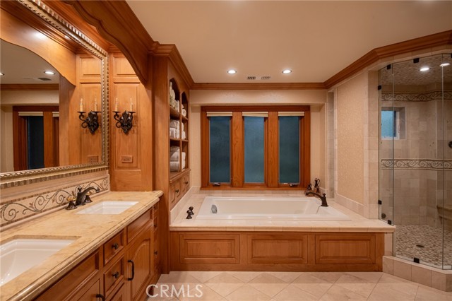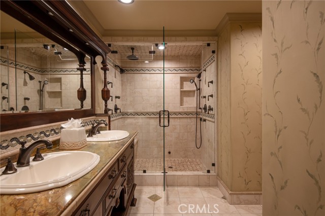 The primary suite is designed as a private retreat, featuring a statement chandelier, hand-painted mosaic tile, steam shower, and spa-quality finishes. Architectural enhancements—including added dormers and custom built-ins—elevate both livability and design.