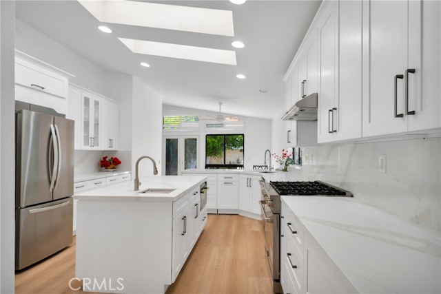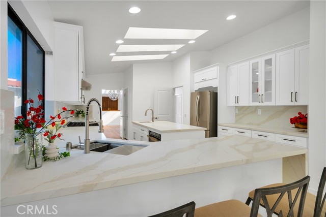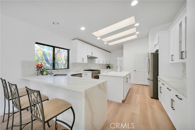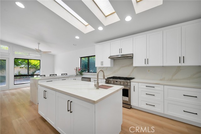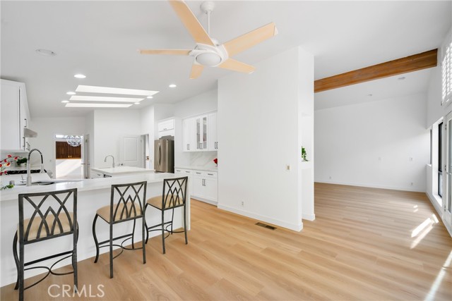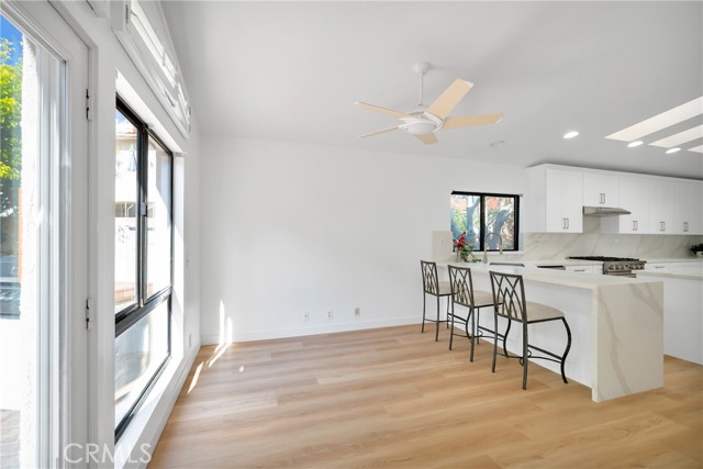 The fully remodeled chef's kitchen is the heart of the home, featuring brand-new high-end appliances, custom cabinetry, stunning quartz countertops, and a showstopping waterfall-edge island. Lux vinyl flooring throughout and a large pantry keeps everything neatly organized. Whether you're doing a casual breakfast in the kitchen nook or hosting a formal dinner in the dining room, this home handles both without missing a beat.