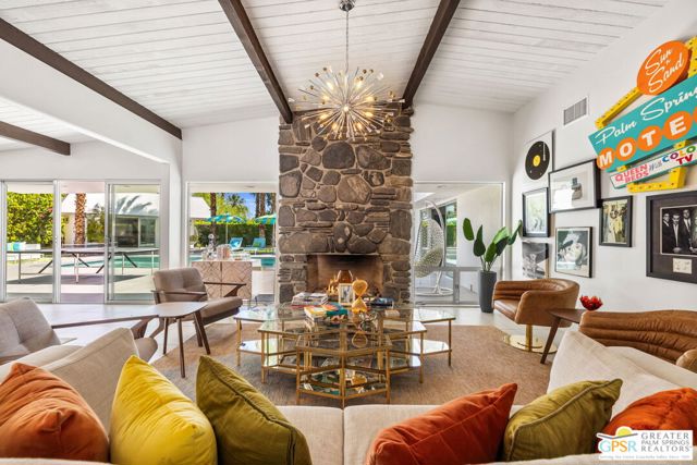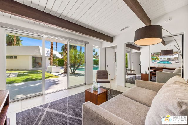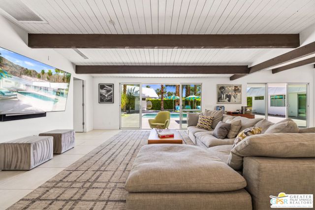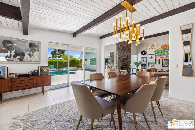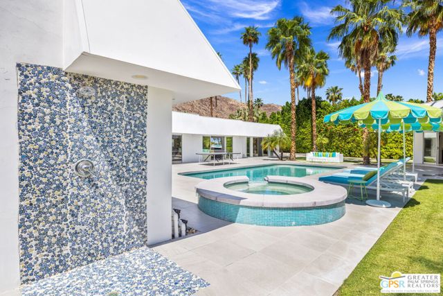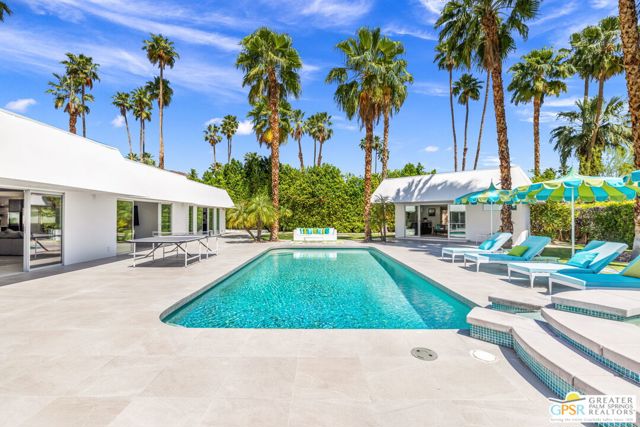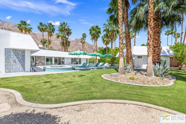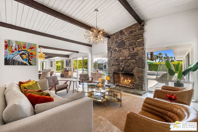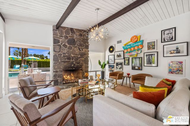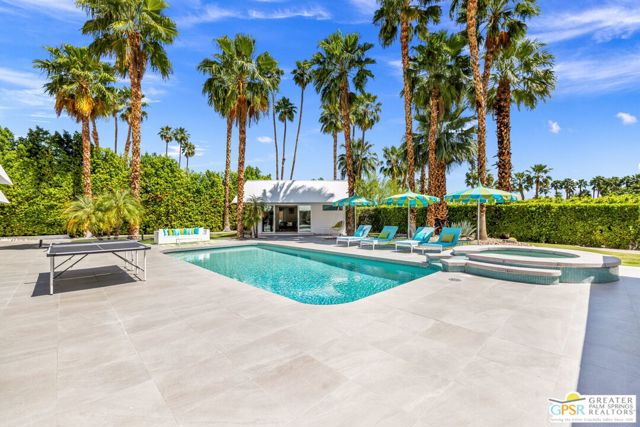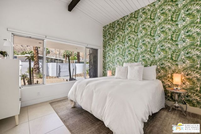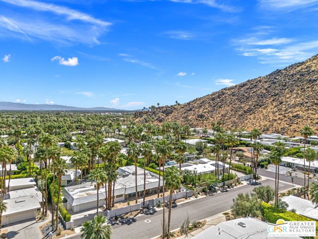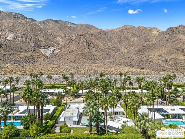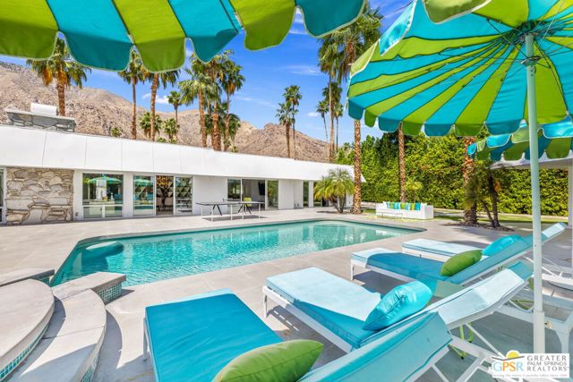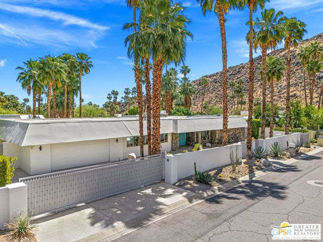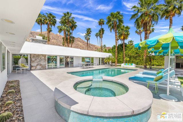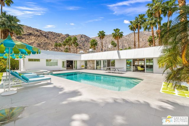 Set in the iconic Vista Las Palmas neighborhood, this reimagined mid-century modern residence originally designed by Charles Du Bois, AIA, and built by Alexander Construction Company blends architectural pedigree with contemporary updates across a spacious 5 bedroom, 5.5-bath layout. Located just blocks from downtown Palm Springs, the home offers easy access to renowned restaurants, retailers, and entertainment. Framed by a dramatic mansard roofline and a private west-facing front yard, the property delivers strong curb appeal, mature landscaping, and views of Dry Falls and Mt. San Jacinto. Inside, vaulted ceilings with exposed beams, tongue-and-groove detail, and walls of glass define the open living spaces, filling the home with natural light and seamless indoor/outdoor flow to a larger-than-most resort-style backyard. All tile flooring throughout, too! The modernized kitchen, anchored by oversized windows that frame the mountains, features quartz countertops, sleek cabinetry, a large island, and stainless appliances opening to the family room, dining area, and formal living spaces, all oriented toward the backyard. The Primary Suite offers a private retreat with fireplace, backyard access, and a spa-inspired bath with dual vanities, soaking tub, walk-in shower, and generous closet. An adjacent exercise room adds flexibility. Junior Ensuites Two and Three offer views and private baths, while Junior Ensuite Four is positioned on the opposite side of the home with its own bath and direct outdoor access. Inside laundry room with sink and dog shower. A detached pool house serves as a fifth ensuite, complete with living area, wet bar, and private bath. Outdoor living is highlighted by a large pool, in-ground spa, outdoor shower, mature palms, and expansive mountain views. Recent improvements include updated HVAC systems and a newer roof. A rare opportunity to own a refreshed architectural classic in one of Palm Springs' most sought-after neighborhoods.