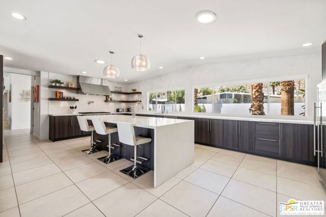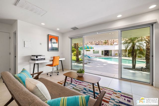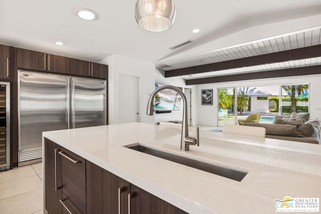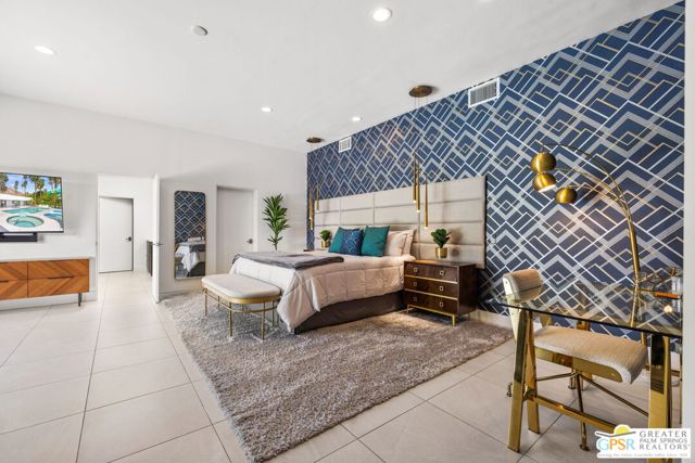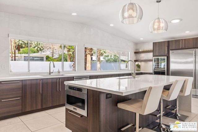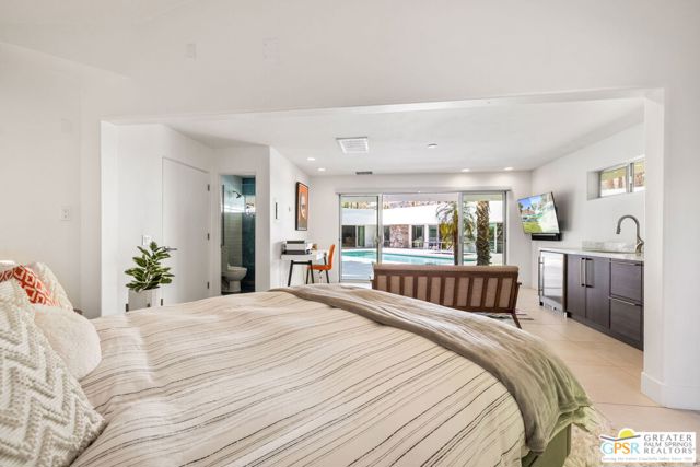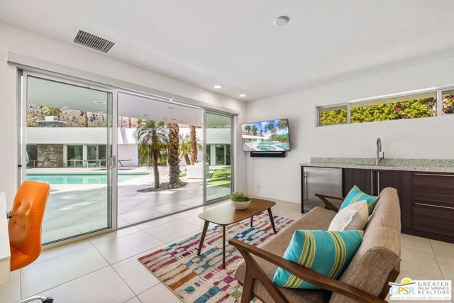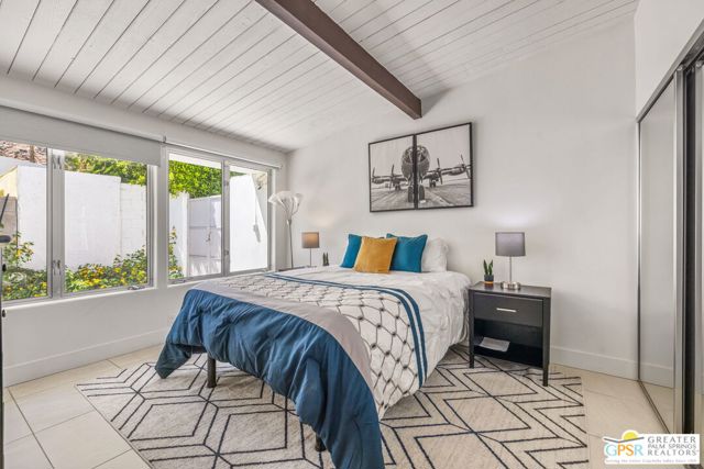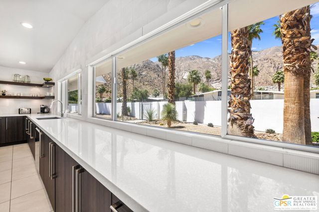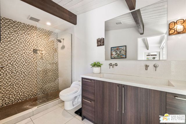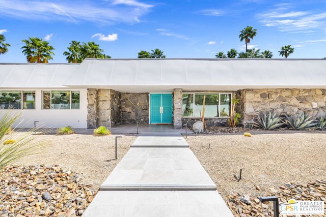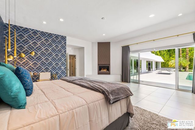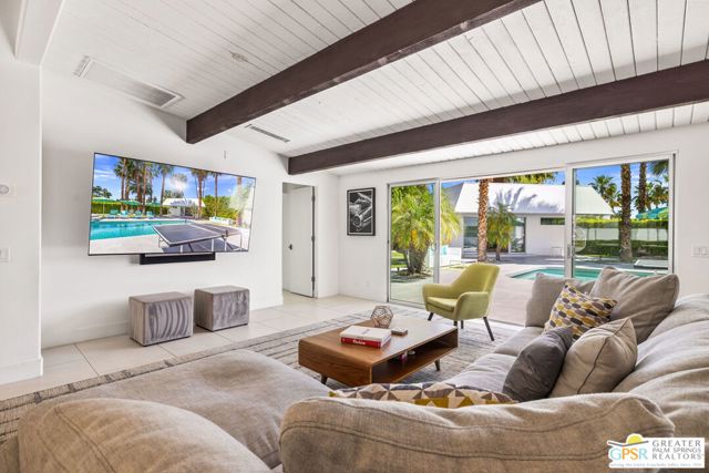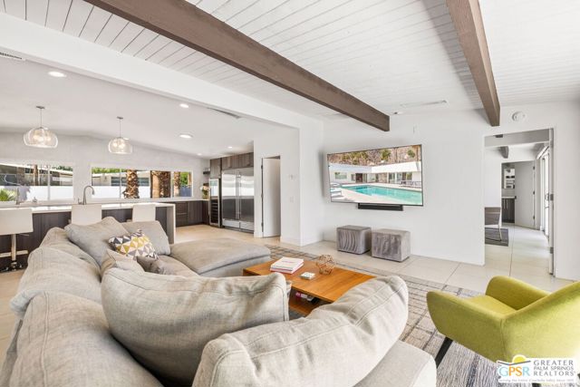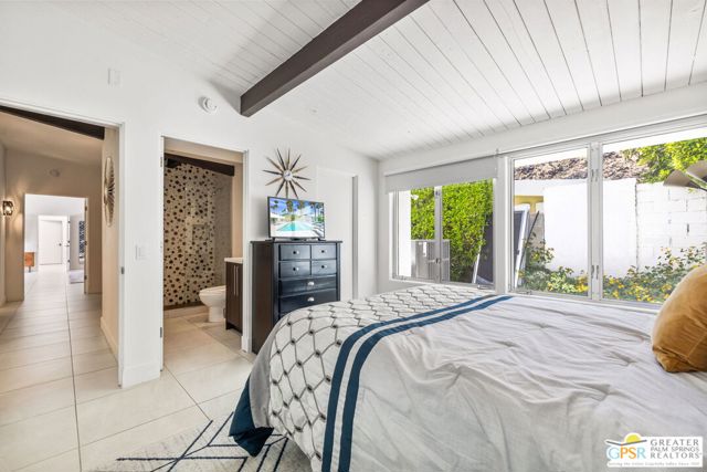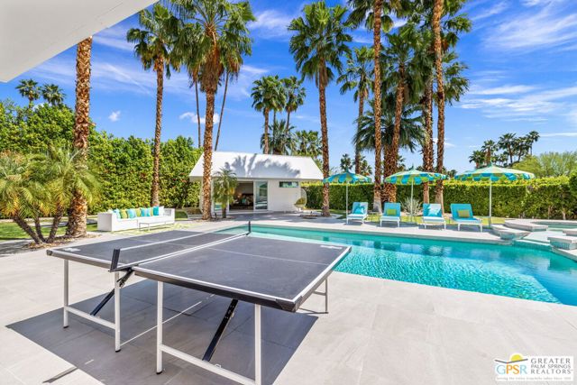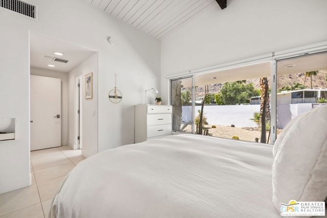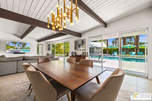 Set in the iconic Vista Las Palmas neighborhood, this reimagined mid-century modern residence originally designed by Charles Du Bois, AIA, and built by Alexander Construction Company blends architectural pedigree with contemporary updates across a spacious 5 bedroom, 5.5-bath layout. Located just blocks from downtown Palm Springs, the home offers easy access to renowned restaurants, retailers, and entertainment. Framed by a dramatic mansard roofline and a private west-facing front yard, the property delivers strong curb appeal, mature landscaping, and views of Dry Falls and Mt. San Jacinto. Inside, vaulted ceilings with exposed beams, tongue-and-groove detail, and walls of glass define the open living spaces, filling the home with natural light and seamless indoor/outdoor flow to a larger-than-most resort-style backyard. All tile flooring throughout, too! The modernized kitchen, anchored by oversized windows that frame the mountains, features quartz countertops, sleek cabinetry, a large island, and stainless appliances opening to the family room, dining area, and formal living spaces, all oriented toward the backyard. The Primary Suite offers a private retreat with fireplace, backyard access, and a spa-inspired bath with dual vanities, soaking tub, walk-in shower, and generous closet. An adjacent exercise room adds flexibility. Junior Ensuites Two and Three offer views and private baths, while Junior Ensuite Four is positioned on the opposite side of the home with its own bath and direct outdoor access. Inside laundry room with sink and dog shower. A detached pool house serves as a fifth ensuite, complete with living area, wet bar, and private bath. Outdoor living is highlighted by a large pool, in-ground spa, outdoor shower, mature palms, and expansive mountain views. Recent improvements include updated HVAC systems and a newer roof. A rare opportunity to own a refreshed architectural classic in one of Palm Springs' most sought-after neighborhoods.