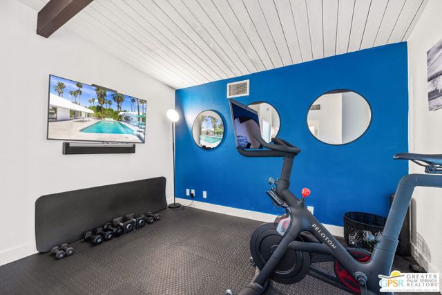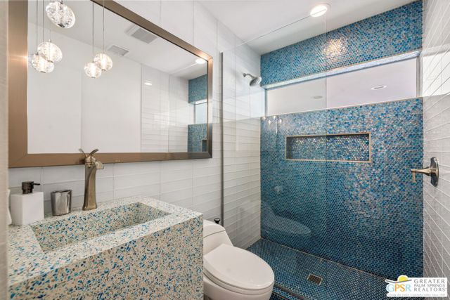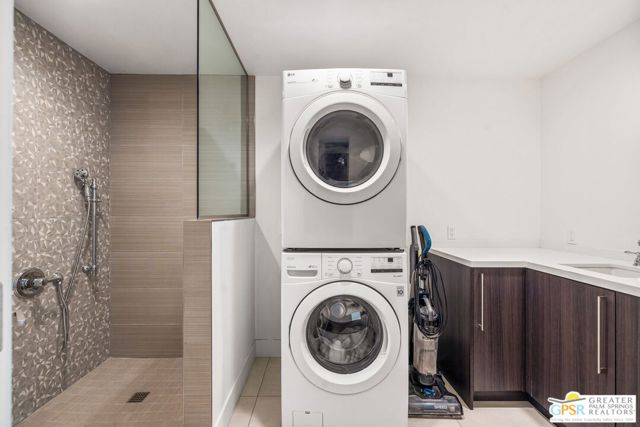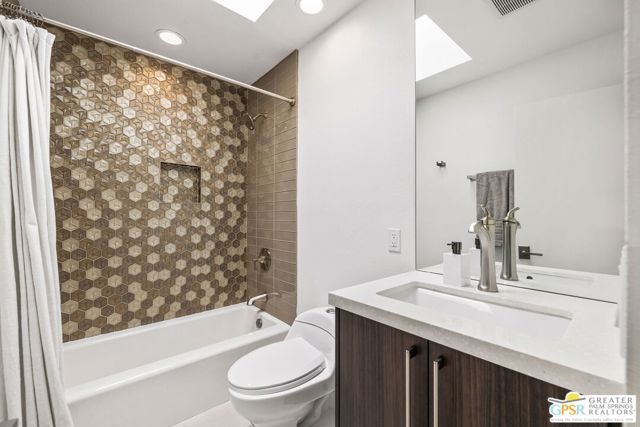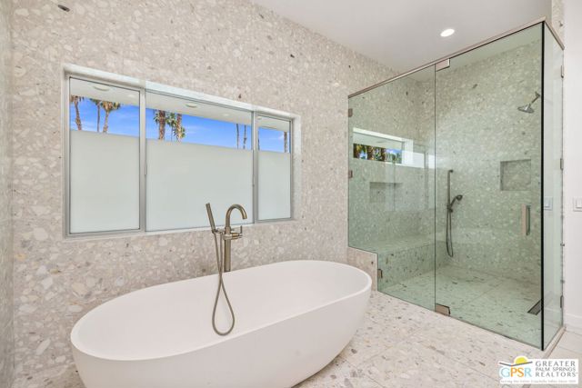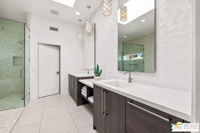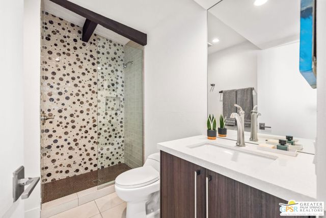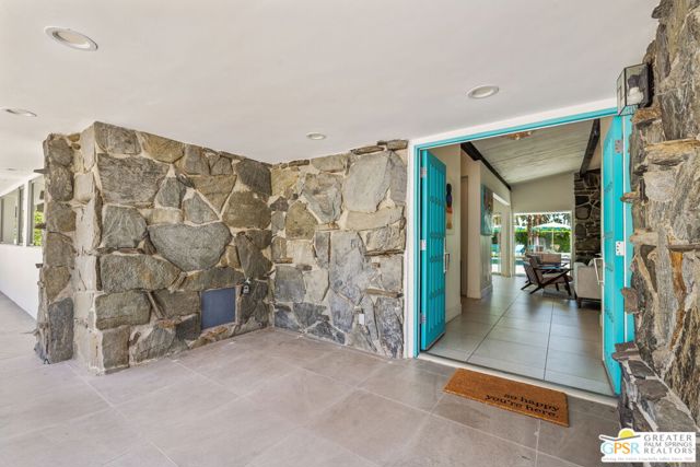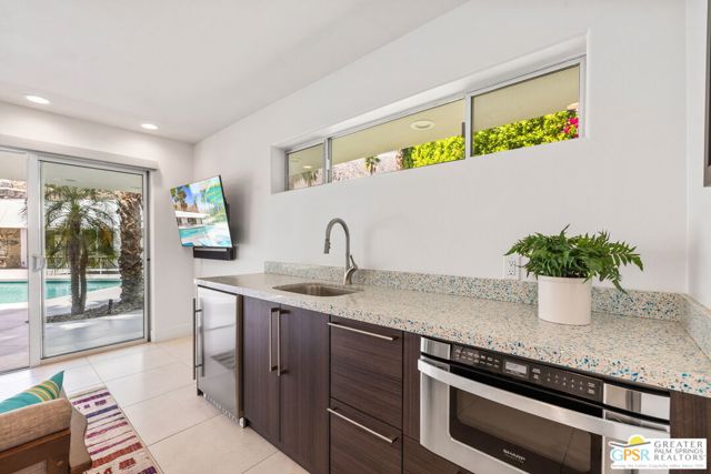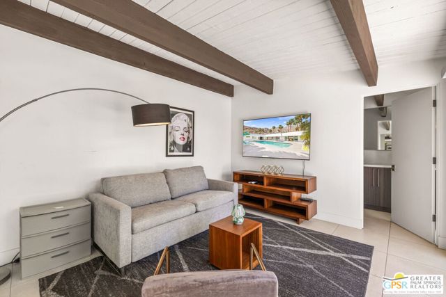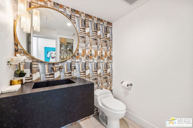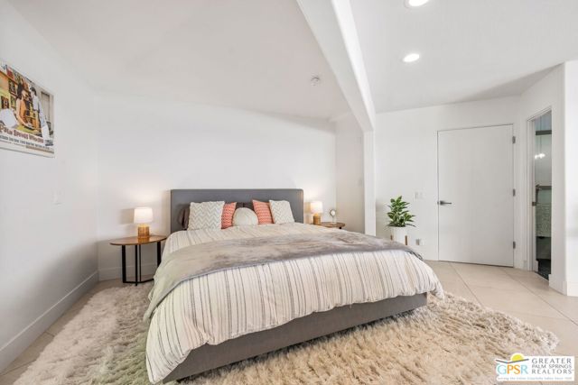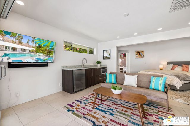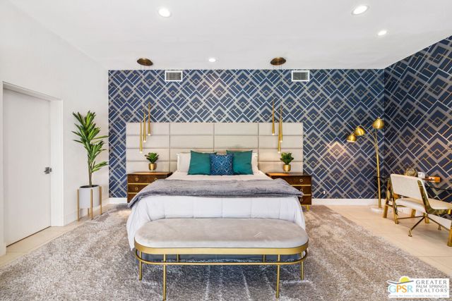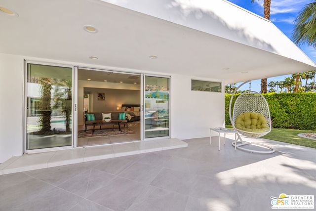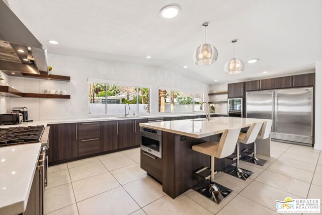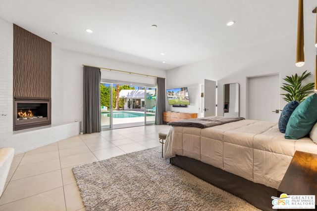 Set in the iconic Vista Las Palmas neighborhood, this reimagined mid-century modern residence originally designed by Charles Du Bois, AIA, and built by Alexander Construction Company blends architectural pedigree with contemporary updates across a spacious 5 bedroom, 5.5-bath layout. Located just blocks from downtown Palm Springs, the home offers easy access to renowned restaurants, retailers, and entertainment. Framed by a dramatic mansard roofline and a private west-facing front yard, the property delivers strong curb appeal, mature landscaping, and views of Dry Falls and Mt. San Jacinto. Inside, vaulted ceilings with exposed beams, tongue-and-groove detail, and walls of glass define the open living spaces, filling the home with natural light and seamless indoor/outdoor flow to a larger-than-most resort-style backyard. All tile flooring throughout, too! The modernized kitchen, anchored by oversized windows that frame the mountains, features quartz countertops, sleek cabinetry, a large island, and stainless appliances opening to the family room, dining area, and formal living spaces, all oriented toward the backyard. The Primary Suite offers a private retreat with fireplace, backyard access, and a spa-inspired bath with dual vanities, soaking tub, walk-in shower, and generous closet. An adjacent exercise room adds flexibility. Junior Ensuites Two and Three offer views and private baths, while Junior Ensuite Four is positioned on the opposite side of the home with its own bath and direct outdoor access. Inside laundry room with sink and dog shower. A detached pool house serves as a fifth ensuite, complete with living area, wet bar, and private bath. Outdoor living is highlighted by a large pool, in-ground spa, outdoor shower, mature palms, and expansive mountain views. Recent improvements include updated HVAC systems and a newer roof. A rare opportunity to own a refreshed architectural classic in one of Palm Springs' most sought-after neighborhoods.