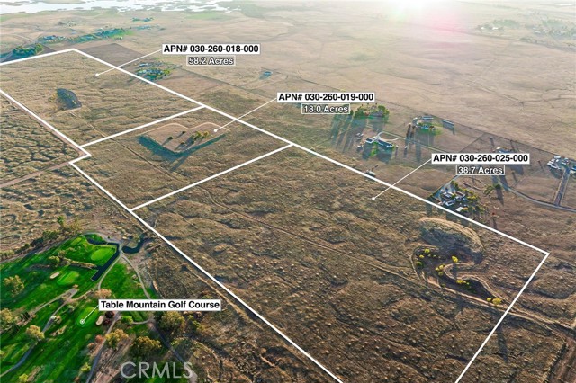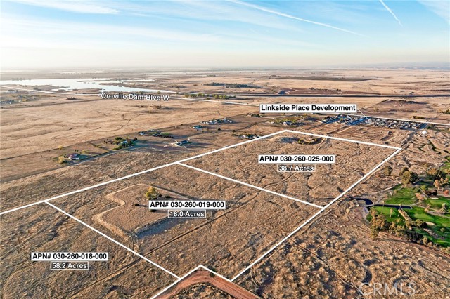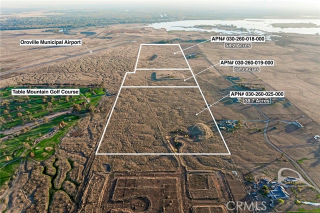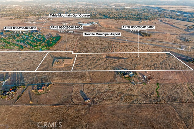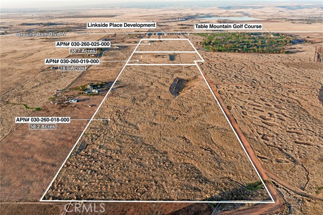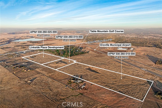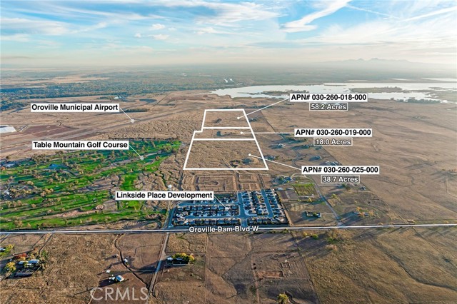 OWNER MAY FINANCE! PRIME GOLF COURSE DEVELOPMENT OPPORTUNITY with this 115± acre land offering located at the edge of the Oroville City Limits and directly adjacent to the 18-Hole Table Mountain Golf Course. Featuring approximately 2,200 feet of golf-course boundary frontage, this property presents exceptional potential for a rural-residential or golf-oriented development concept, including 5-acre estate lots under the current RR-5 zoning. The land borders Linkside Place Phase II to the north, including the tentatively approved Linkside Place Phase II subdivision consisting of 56 future homesites. Phase II has underground utilities already installed and roads graded, awaiting paving, signaling strong forward momentum for continued residential growth in this corridor. Linkside Place Phase I, just north of Phase II, was completed in recent past with 65 homes and demonstrates proven development success in this immediate area. This prime 115± acres is made up of three legal parcels: APN 030-160-019 (18.08± acres), APN 030-260-025 (38.79± acres), and APN 030-260-018 (58.24± acres). Just over 1,000 feet west lies the previously City-approved 421-acre Oro Bay master plan area, once approved for approx. 2,400 homes, showing the long-term development vision for this part of Oroville. Power, water, and sewer currently extend to Linkside Place Phase II at the northern boundary of this property. With Oroville’s growing population, multiple new housing projects underway, and demand for quality development opportunities, this acreage sits directly in the path of expansion. Located just south of Oro Dam Blvd, the main connector between Highways 70 and 99, and approximately 4 miles to downtown Oroville, 25 miles to Chico, and 70 miles to Sacramento. Close to recreation including Lake Oroville, the Feather River, and the Afterbay recreation and boat launch facilities just up the road.