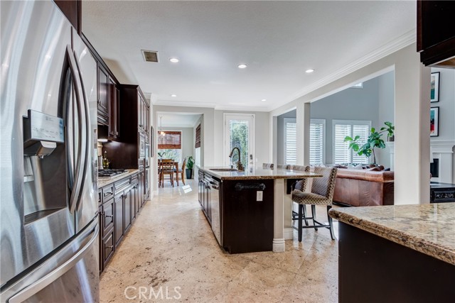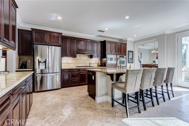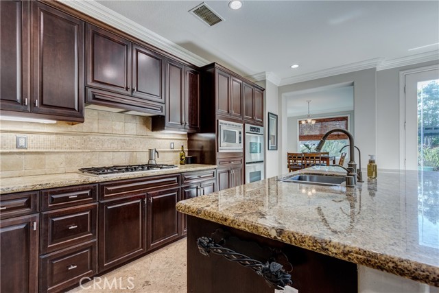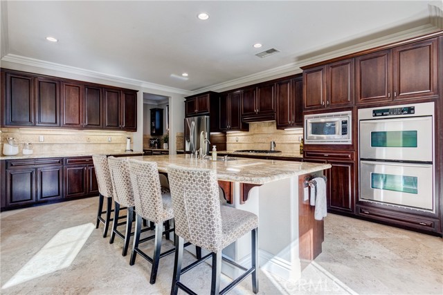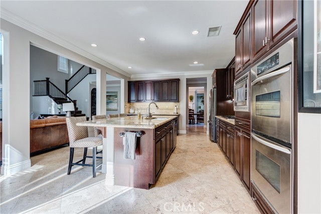 The gourmet kitchen is equipped with dual ovens, a large center island, and an open-concept layout that flows seamlessly into the main living area, along with an additional informal dining space.