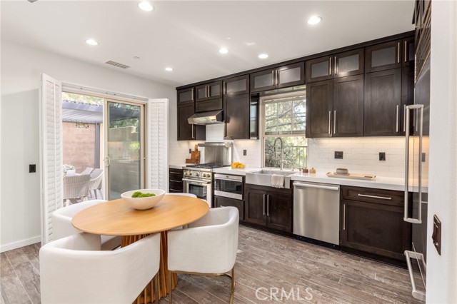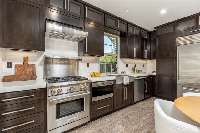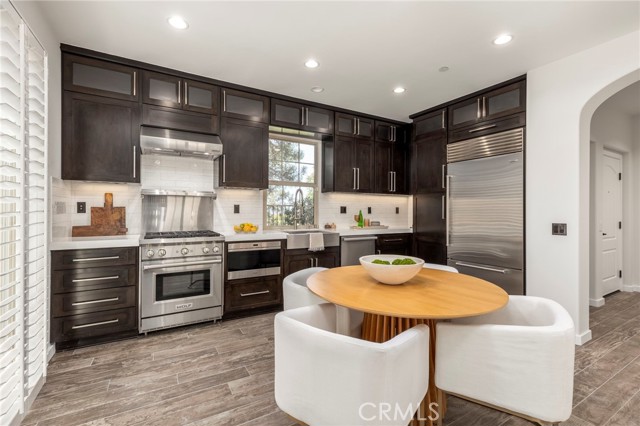 The chef’s kitchen is a showstopper, boasting custom espresso cabinetry with soft-close features, pull-out pantry drawers, and top-tier stainless steel appliances, including a built-in Sub-Zero refrigerator and Wolf range. Quartz countertops, a new subway tile backsplash, and a farmhouse sink overlooking uninterrupted nature views make this space as functional as it is beautiful. With effortless indoor-outdoor flow, the adjoining dining area is perfect for hosting al fresco dinners or casual brunches.