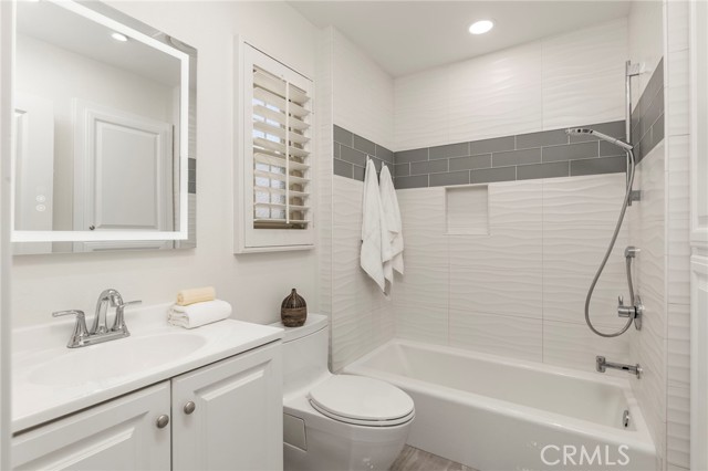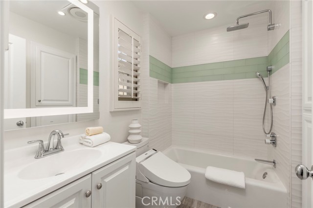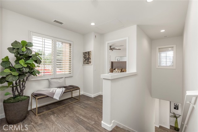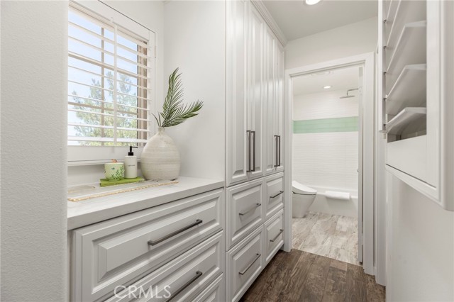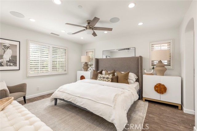 Retreat upstairs to the sunlit primary suite, a private oasis with multiple windows, plantation shutters, and a spacious walk-in closet. A separate dressing area with custom built-ins adds a touch of luxury, while recessed lighting and built-in speakers complete the tranquil ambiance.