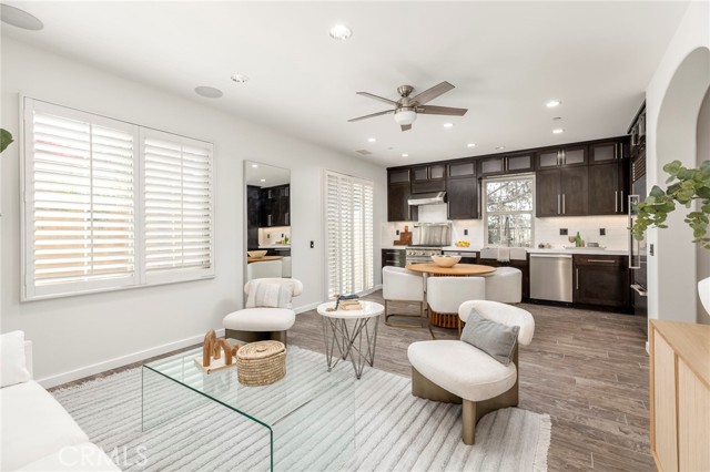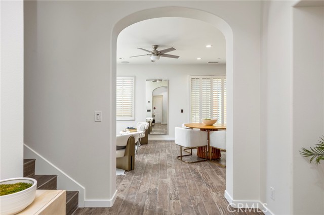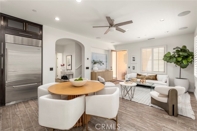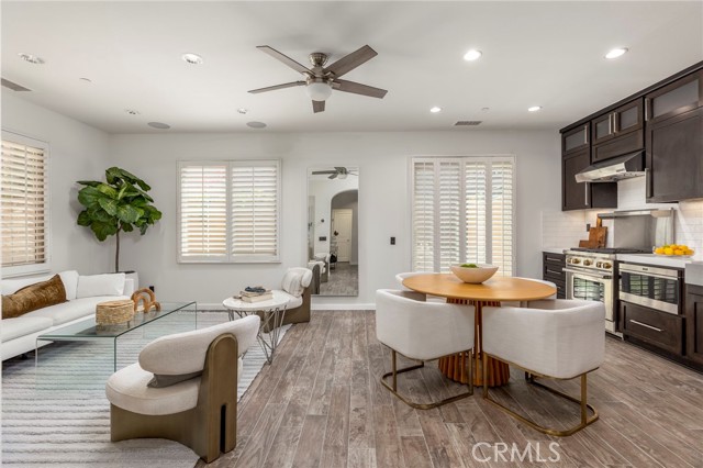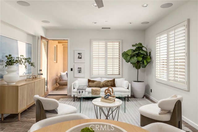 Step inside to an open-concept floor plan bathed in natural light, where every detail has been thoughtfully curated. Elegant wood-grain tile flooring flows seamlessly through the main living areas, complemented by plantation shutters and recessed lighting that enhance the home’s timeless charm. The living room, with its adjacent outdoor spaces and built-in speakers, is an ideal hub for both quiet relaxation and lively entertaining.