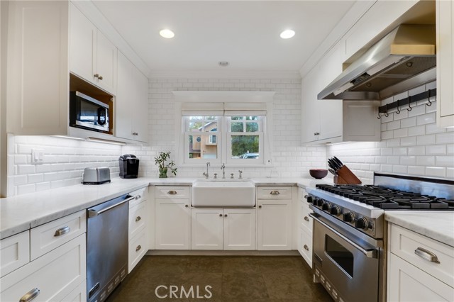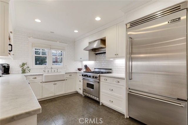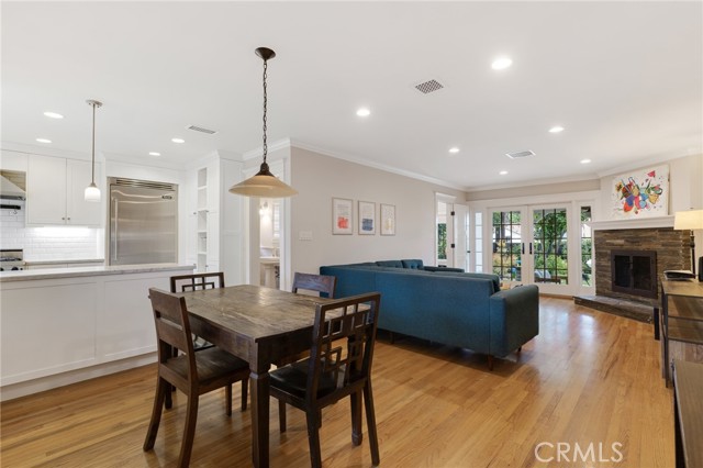 Inside, the updated kitchen features white shaker cabinetry, Carrara marble countertops, and high-end stainless-steel appliances, including a Viking refrigerator, 6-burner range, and dishwasher. A farmhouse sink, pot rack, built-in pantry, and custom bookshelves add to the character. The kitchen flows seamlessly into the dining area and inviting living room, with a stone fireplace and French doors with views of the yard.