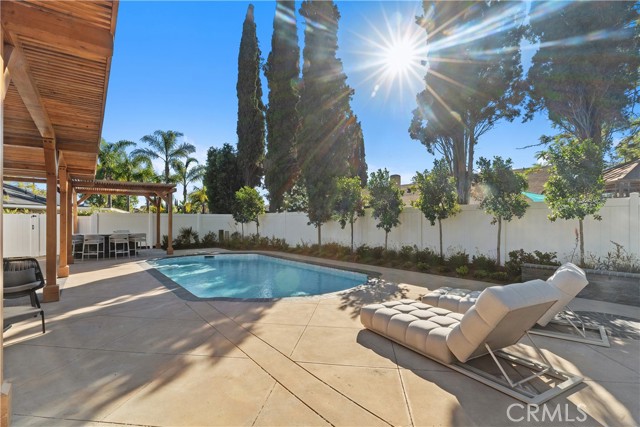 Enjoy seamless indoor-outdoor living in a backyard designed for both leisure and entertaining. The sparkling pool has been fully updated with new plaster, coping, heater, and a saltwater filtration system. The built-in barbecue center includes a new gas grill, refrigerator, and ample space for gathering. The expansive yard offers a large patio shaded by a pergola, fresh landscaping, and a fully upgraded irrigation system—all enclosed by new fencing for added privacy.