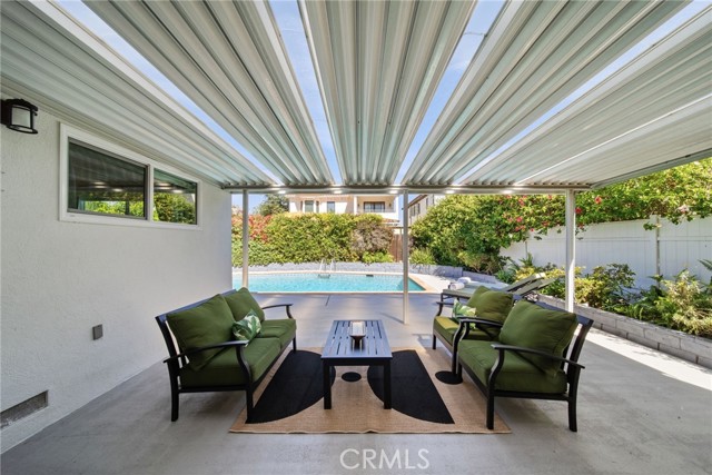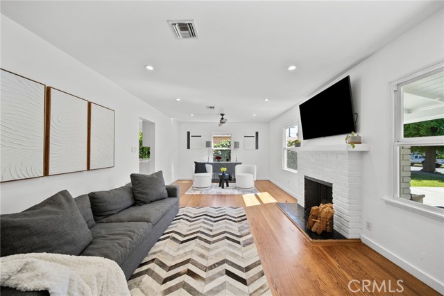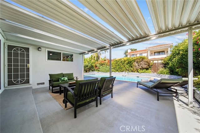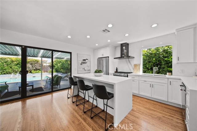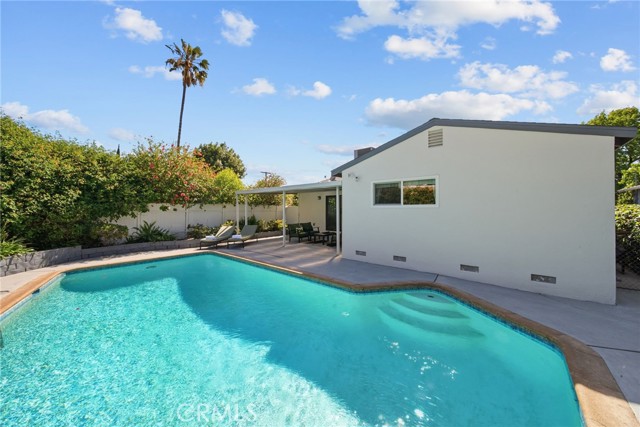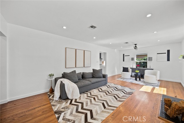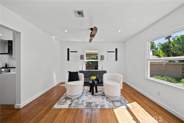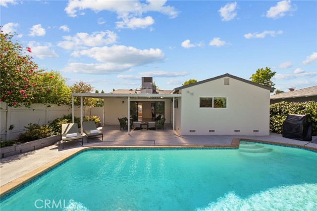 Welcome to this sleek, updated mid-century pool home in Valley Glen, designed for the best of indoor-outdoor California living. The bright, open living room is filled with natural light and flows beautifully into the open-concept kitchen and airy dining area. Modern double-pane black sliders frame views of the backyard and create a seamless connection to the sparkling pool, covered patio, and outdoor entertaining spaces—perfect for relaxed everyday living, intimate dinners, or larger gatherings under the stars.